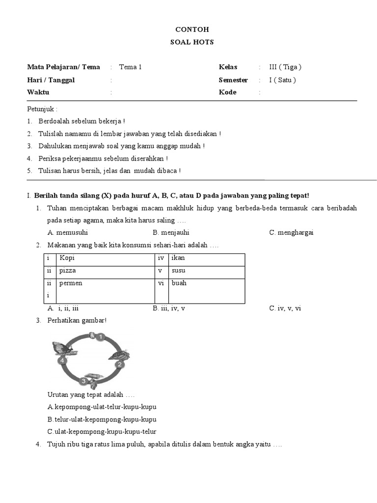 Berikut adalah beberapa contoh soal HOTS yang dirancang untuk peserta didik kelas 3 SD, lengkap dengan indikator HOTS dan penjelasannya.