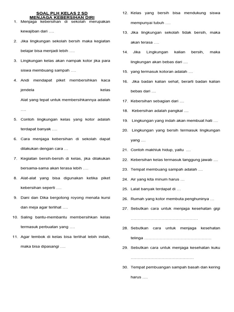 Berikut adalah kumpulan contoh soal PLH kelas 3 SD semester 2 yang meliputi berbagai bentuk, yaitu pilihan ganda, isian singkat, dan uraian. Soal-soal ini dirancang untuk menguji pemahaman siswa terhadap materi yang telah dijelaskan di atas.